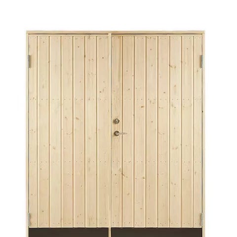 dubbeldörrar tillverkade i trä med blå/grön färg. Dörrarna har paneldetaljer. En av dörrarna har en mindre skada vid nederkanten.