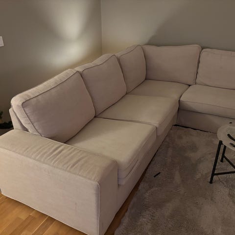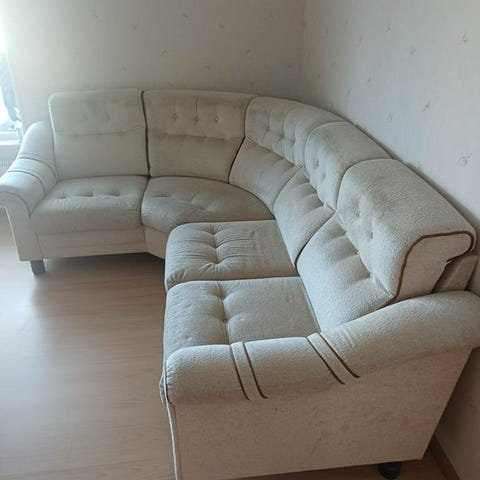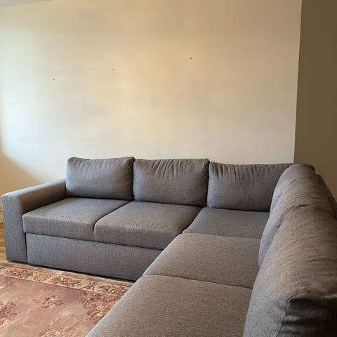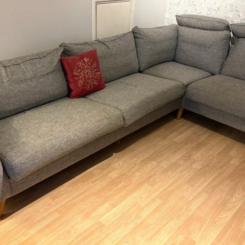 Grå tygsoffa med hörnsektion, bestående av flera sittplatser och ryggkuddar. Soffan är klädd i grått tyg och har en modern design med raka linjer och avskalat utseende. Passar för vardagsrum och gemensamma utrymmen.