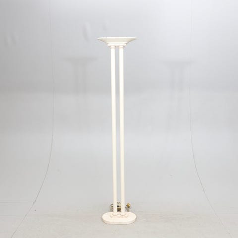 Omärkt, så gissar på en tidsenlig exklusiv kopia av den klassiska Arco-lampan (Flos) då det är sten/gipsfot och inte marmor. Hittade en likadan i krom på Auktionnet (nr 3724522) för 4000 kr från 2024 som dock tycks sakna originalskruvar bl.a. på den skjutbara armen.