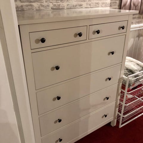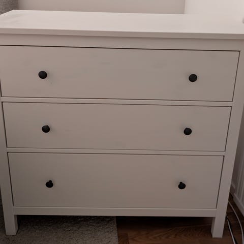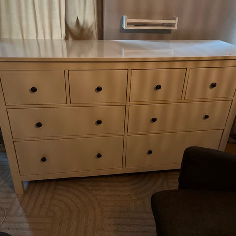 IKEA Hemnes byrå i vit färg med åtta lådor. Funkar jättebra som garderob och rymmer mycket. Tyvärr får jag inte plats med den längre. Haft den i några år så den har lite små repor men den är i bra skick och lådorna funkar fint!