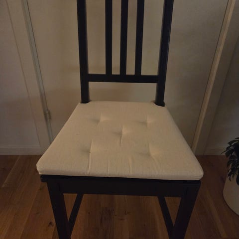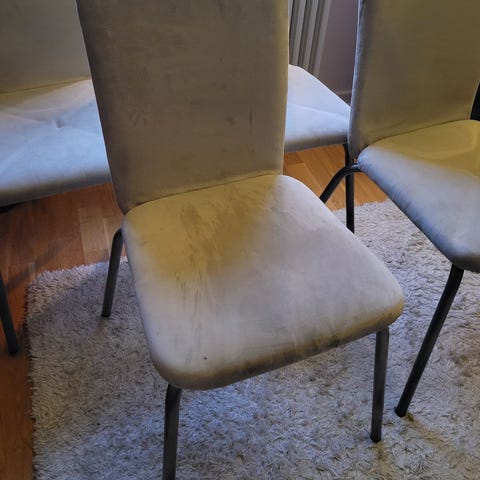 Fem köksstolar i konstläder. Liknar ”Sjuan”. Lädret har lite struktur. Paketpris för alla fem 1500kr. En och en 350kr/st.