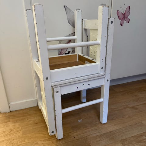 Jollyroom matstol för barn med svart sittdyna och vit bricka. Stolen har en stabil ram och är avsedd för barn att sitta säkert vid matbordet.
