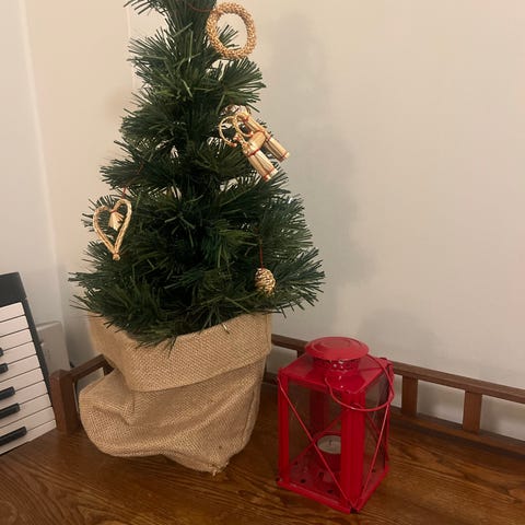Dekoration föreställande en julgran med vacker inbyggd belysning och julhängen.