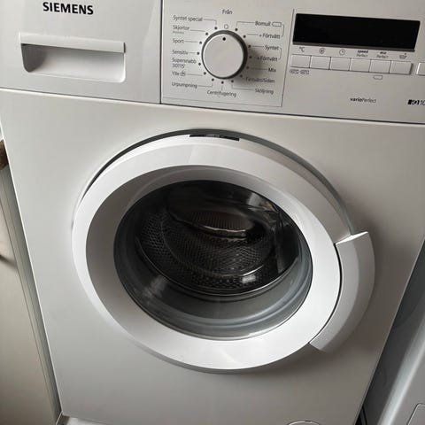Siemens frontmatad tvättmaskin med digital display och flera tvättprogram, köpt 2024.