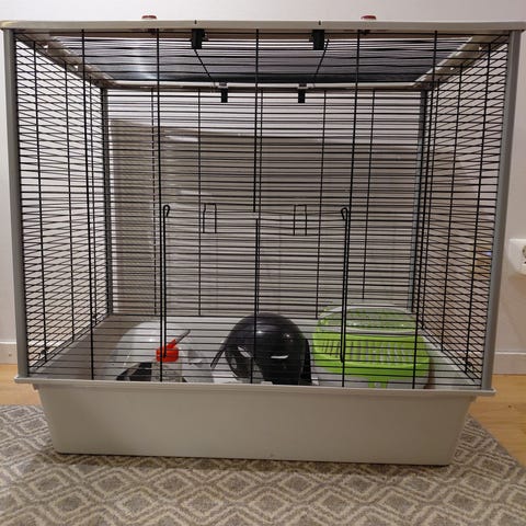 Finns en trappa mellan våningarna. Går att ha som en stor bur eller stänga av och ha som två burar.