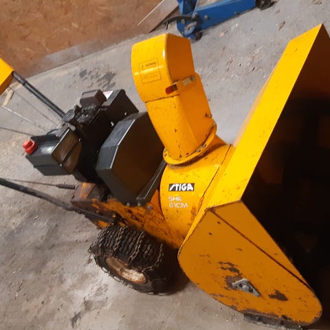 Snöslunga startar lätt och motorn går fint men drivrem och snöskruv är demonterat och reservdelar behöver införskaffas. Se bilder.