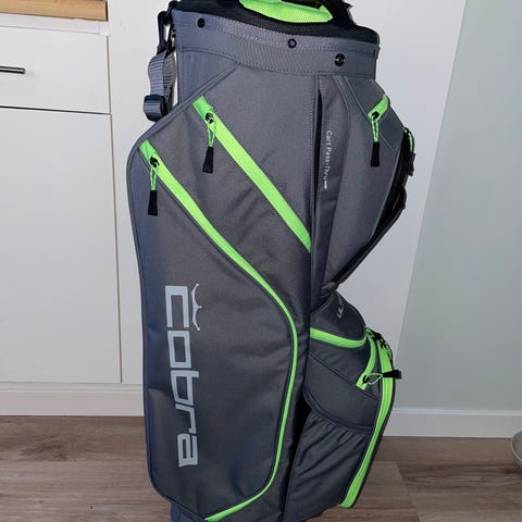 Cobra LA Traxion Pro golfbag i svart och vit färg. Golfbagen är designad för att bära golfklubbor och utrustning. Den har flera fickor och bärrem för enkel transport.