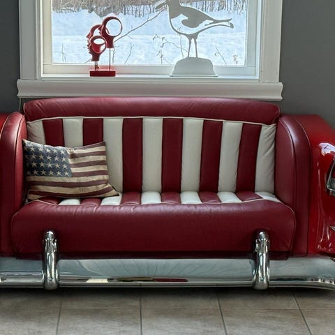 En häftig tvåsitsig bilsoffa med brunt skinn. Sliten look, perfekt i garaget eller varför inte en häftig detalj i vardagsrummet.