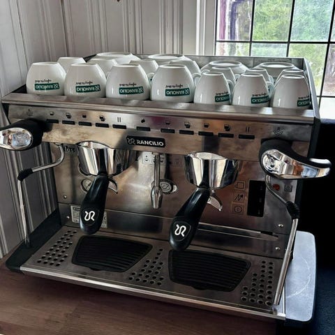 La Spaziale Espressomaskin med två grupper för bryggning av espresso. Maskinen är tillverkad i rostfritt stål och har en robust konstruktion lämpad för kommersiellt bruk. Utrustad med portafilter och ångstav för mjölkskumning.