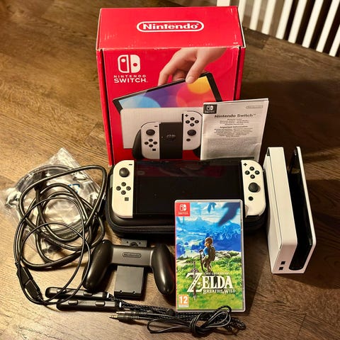 Konsolen har en OLED-skärm som ger förbättrad bildkvalitet. Produkten levereras komplett med originalförpackning och tillbehör inklusive laddare och Joy-Con-kontroller.