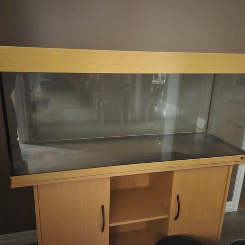 Har kartongen till akvariet kvar så man kan frakta hem den i bilen lite säkrare. Akvariet väger ca 20 kg, men ta med bärhjälp för säkerhets skull.