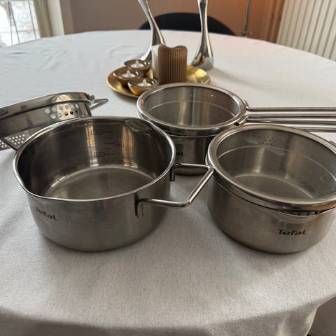4 st. oanvända Fondue grytor i rostfritt med 24 gafflar.