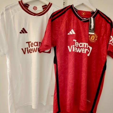 Umbro Manchester United fotbollströja med nummer 10 och namn Nistelrooy på ryggen. Tröjan är vit med svarta detaljer och har Vodafone-logotypen fram. Material och storlek är inte angivna.