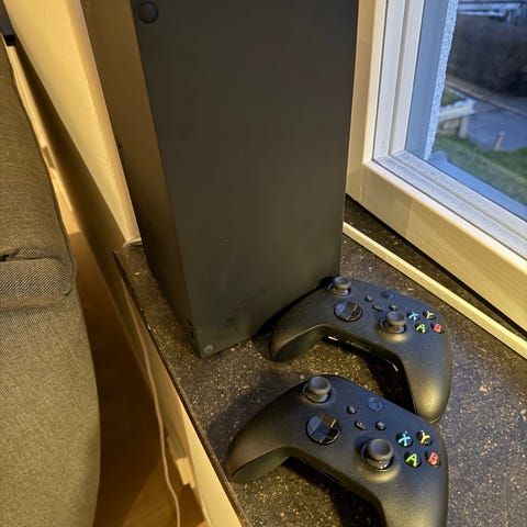 Xbox Series spelkonsol med flera handkontroller i olika färger och mönster. Inkluderar spelet Call of Duty Black Ops 6 Konsolen är avsedd för spel och underhållning.