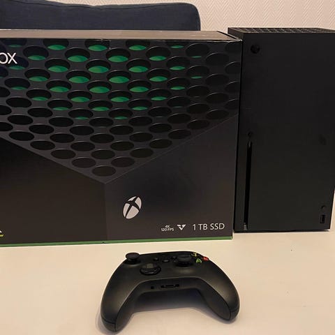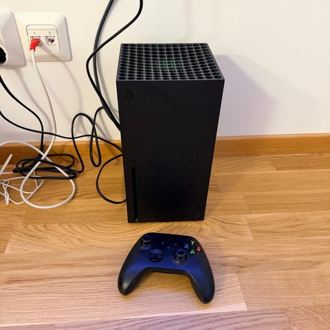 Xbox Series Xbox Series X spelkonsol med tillbehör inklusive två handkontroller i svart och blått, laddningsstation och strömkabel. Konsolen har en svart design och är avsedd för Xbox Series-plattformen.