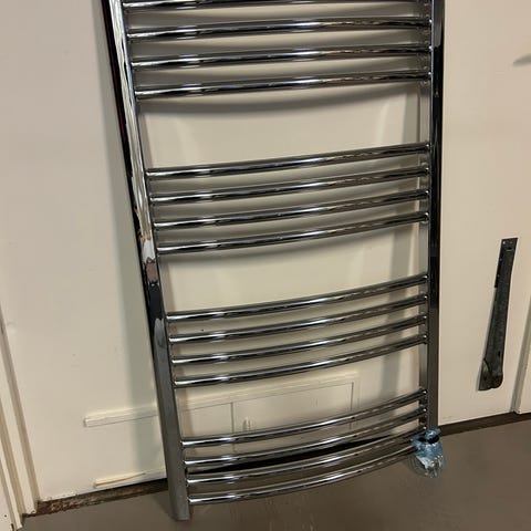 OBS, den saknar kåpa till kopplingen. Allt annat ska finnas. Fungerar i övrigt utan problem. Handdukstork i kromat stål med horisontella ribbor. Den går på el, kopplas in i väggen.