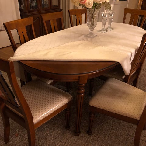 På Mio hittade vi ett stort bord som är 2 meter långt, men har en sk "butterfly-skiva" som kan förlänga bordet med 90 cm extra. Då får vi lätt plats med 5 personer på varje långsida :-)