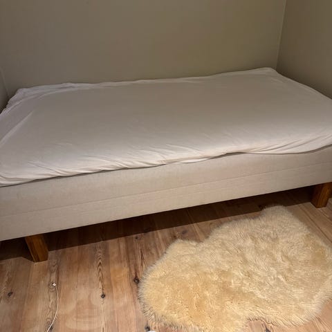 Resårbotten med mörkgrå klädsel. Fast. Finns att hömta i Skanör.