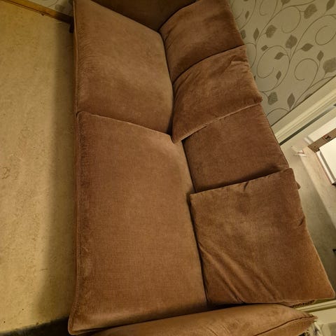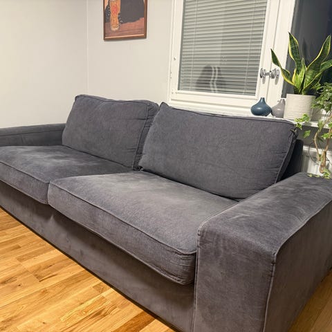 Stor beige soffa med ett sittdjup på 80 cm.