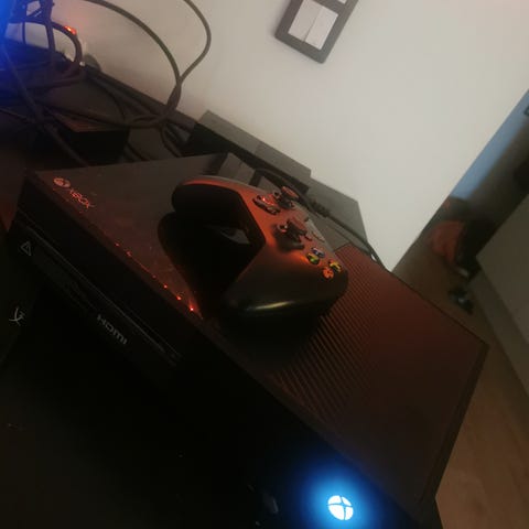 Xbox One spelkonsol inklusive två handkontroller i svart och blå färg. (En är trådbunden) Funkar perfekt och är återställd för en ny användare
