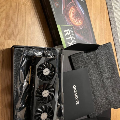 MSI Gaming X Trio GeForce RTX 3070 grafikkort med tre fläktar för kylning. Grafikkortet levereras i originalförpackning med skyddande skuminsats och tillbehör. Designat för högpresterande datoranvändning och spel.