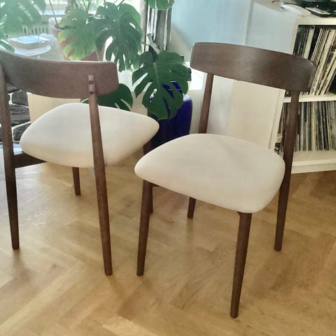 Fyra fina och stabila matstolar av solid ek. Hel trästomme och stoppad sits men behöver nytt tyg för att bli riktigt snygga igen.