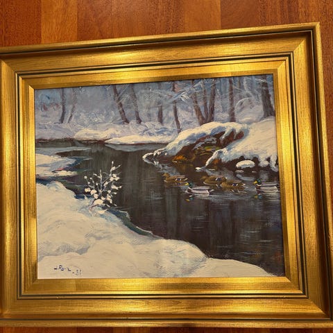 Oljemålning på duk som föreställer två buskskvättor, sittande på en gren med gröna löv och röda bär i bakgrunden. Målningen är signerad G. Adon. Ny ram med guldfärg.