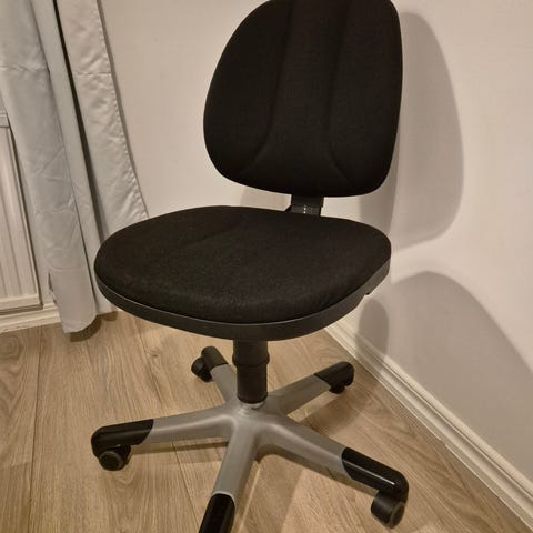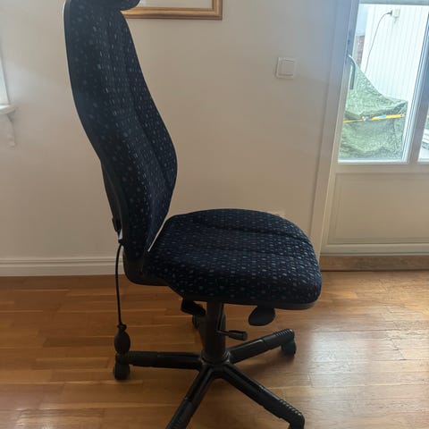 Mycket stadig och rejäl (och tung) svart kontorsstol från RH. Kan höjas och sänkas och ställas in på fler sätt. Armstöden är slitna som syns på bilderna, men de fungerar bra. Du kan antingen fixas till eller skruvas bort helt om man hellre vill.