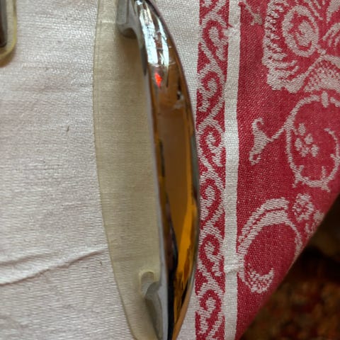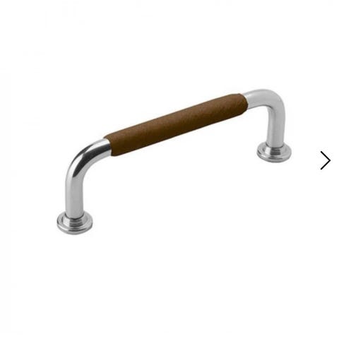 Finnes: 26 st kökshandtag i nickel och brunt läder. Skruvar till handtagen finns.