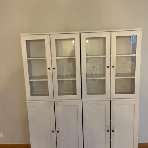 IKEAS vitrinskåp LEKSVIK söker sin nya ägare. Ommålad till vitt (original träfärg) och fönsterfilmen går att ta bort om man så vill. Har utgått ur sortimentet. Hämtas på plats, ta med bärhjälp.
