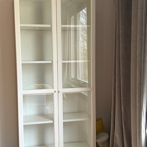IKEAS vitrinskåp LEKSVIK söker sin nya ägare. Ommålad till vitt (original; betsat i mörkt) och fönsterfilmen går att ta bort om man så vill. Har utgått ur sortimentet. Hämtas på plats, ta med bärhjälp.