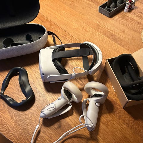 Oculus Quest 2 VR-headset med tillhörande handkontroller och kompatibelt BOBOVR M2 PRO huvudband. Produkten är i vitt och svart, avsedd för virtuell verklighet.