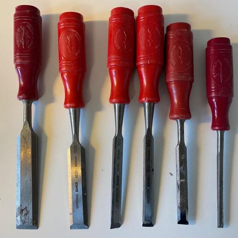 Parti med stämjärn och bildhuggarjärn. Märken inkluderar Swiss Made och Bracht.