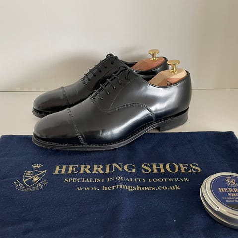Blanka svarta oxford cap-toes i mycket fint skick. Kalvskinn, tillverkade i England. Storlek 9 1/2G, dvs lite bredare passform på lästen 026G. Svensk storlek 43,5. Inga skador eller defekter. Minimalt klackslitage. Funkar även till smoking i och med hög glans. Fjäderskoblock medföljer så att de inte far illa under transport.