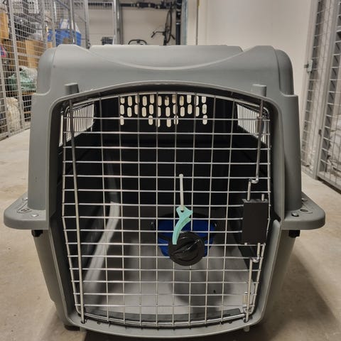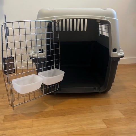 Transportbur för små djur med ventilationshål och metallgrind. Burens överdel är beige och underdelen svart. Lämplig för säker transport av små husdjur.
