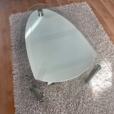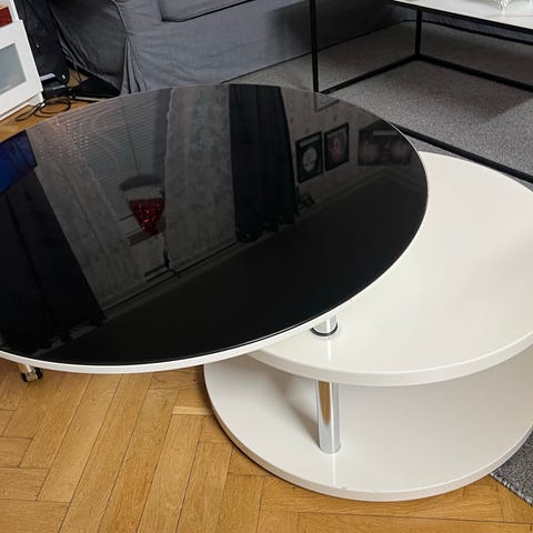 Praktiskt och fint soffbord i vit och en rörlig glasskiva med hjul.
