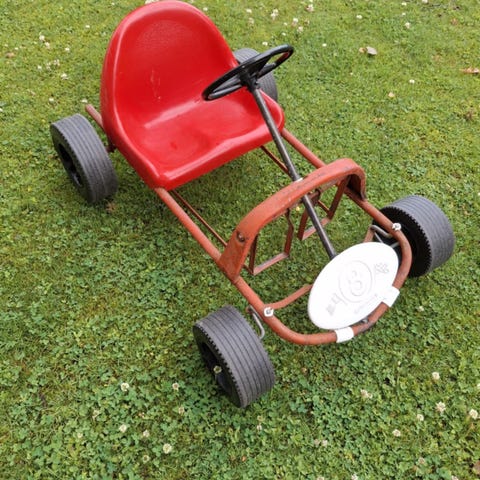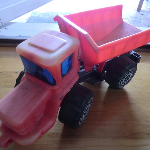 väl använd men fint fungerande trehjuling med tippflak, 50 kr.
