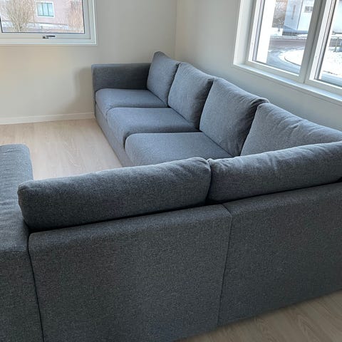 Sparsamt använd stor soffa. Sits Sara.