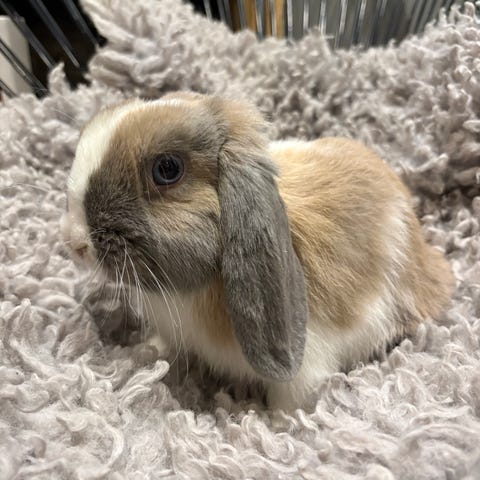 Hon är pigg och frisk. Social ibland och går ibland att ta upp henne någon stund. Hon tycker om sallad, morot och äpplen.