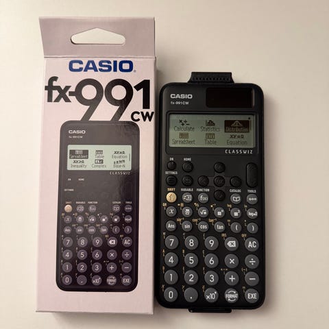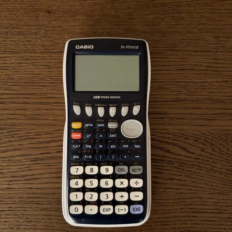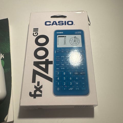 Casio fx-7400GII grafritkalkylator i blå färg. Kalkylatorn har flera funktioner för grafritning och matematiska beräkningar.