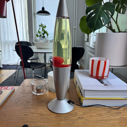 Säljes: Lavalampa med rött ljus och blå ”lava”