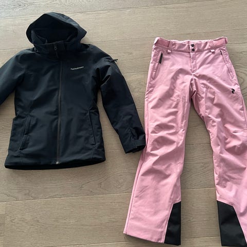 Lätt fodrat, jacka med huva och liftkortsficka. Byxor med bra fickor och snölås.
