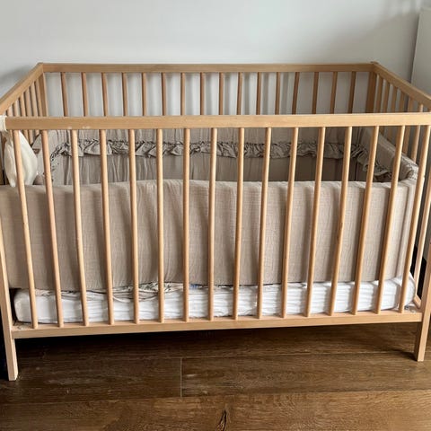 Nedmonterad med alla skruvar och beslag samlade i en påse. Enkel att montera, och manualen medföljer. Spjälskydd och madrass ingår ej.