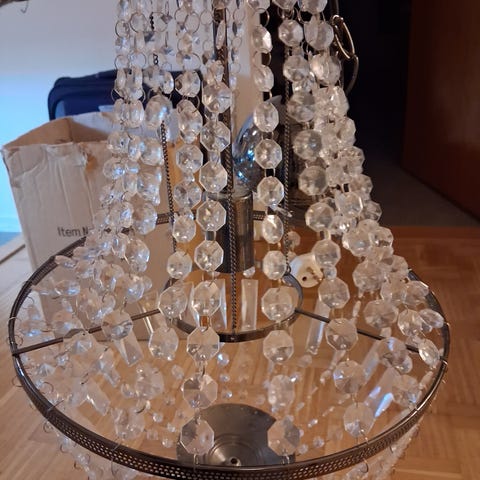 En elegant bordslampa med en transparent skärm och kromad fot. Lampan har plats för tre ljuskällor och dekorativa detaljer i form av prismor.
