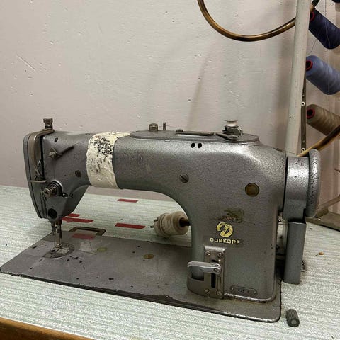 Den syr enkelt igenom remläder eller lager av kapellväv. Maskinerna är av riktig kvalitet som lär hålla i decennier. Kan sy vanliga saker också.