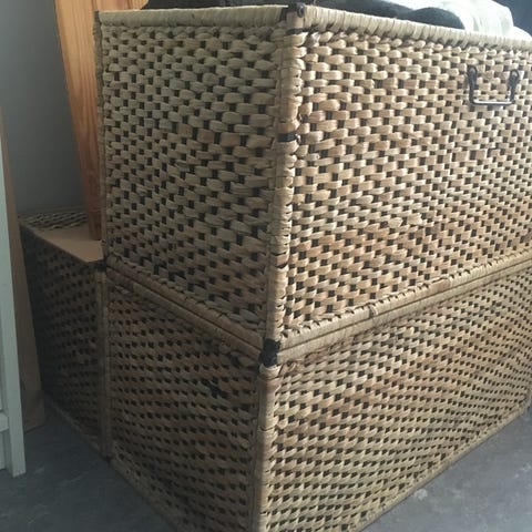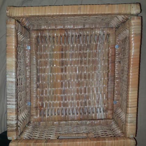 Förvaringskorg tillverkad i flätat material med lock. Korgen är fyrkantig och erbjuder förvaringsutrymme för olika ändamål. Passar för organisering och förvaring i hemmet.