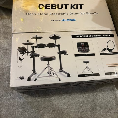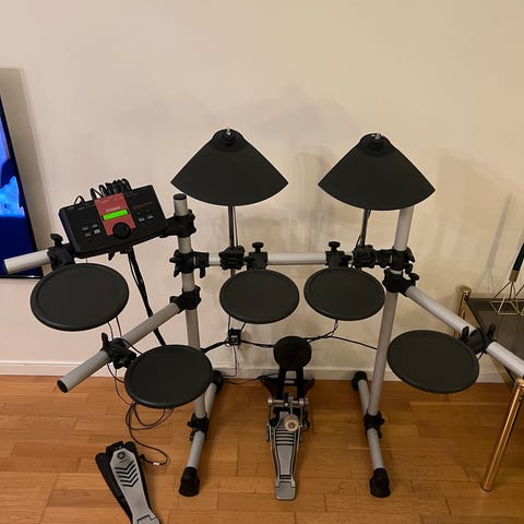 Elektroniskt trumset med trumplattor, cymbaler och pedaler. Setet är designat för att efterlikna ett akustiskt trumset och är lämpligt för både övning och uppträdanden i olika miljöer.
