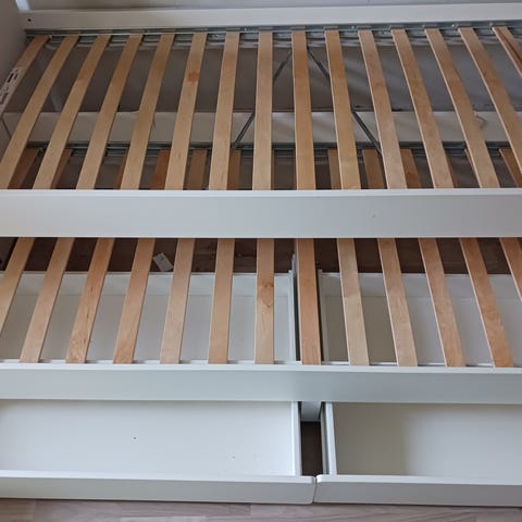 El sängar med ribbotten och madrass i storlek 90x200 cm med 2 st sängbord. Färgen är vit och materialet består av trä och textil. Kan använda som enkelsäng eller dubbelsäng