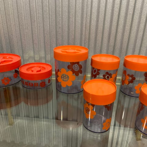 Burken är transparent med rosa ränder och har ett rosa lock.