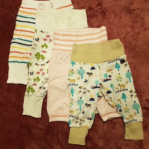 3 par byxor i bomullstrikå, storlek 68. Använda men i mycket bra skick.